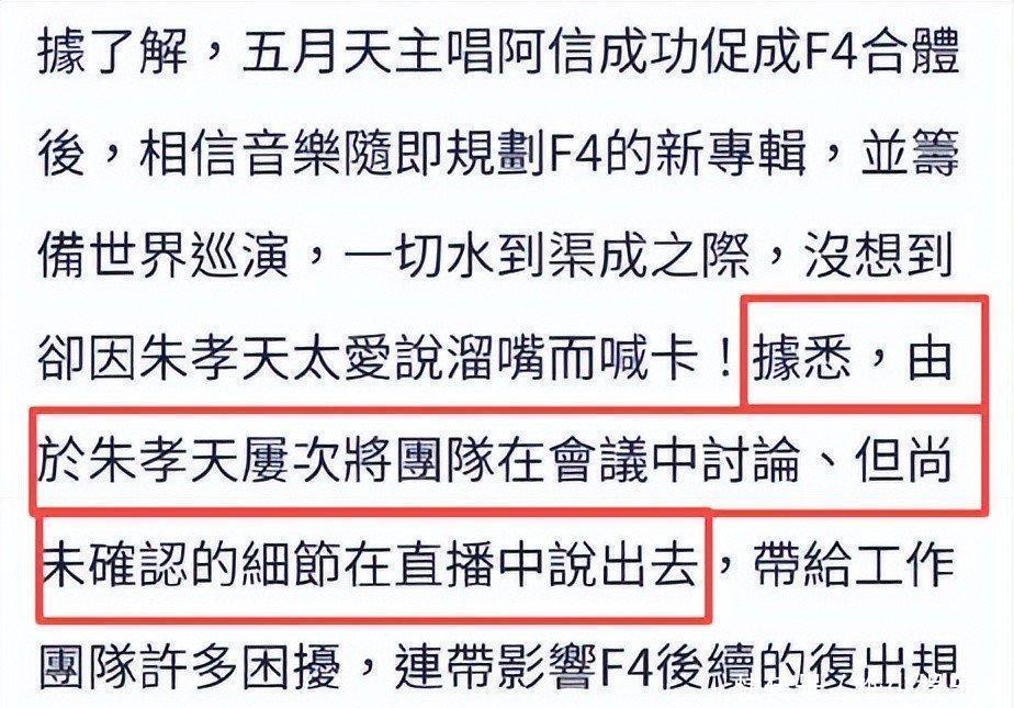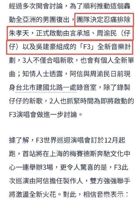 朱孝天这半年其实挺受关注的,主要因为他曾公开说过跟其他三位成员联系不多。近来有媒体爆料说他让"F4"组合给除名了,后来还有音乐公司出面确认了这事,消息一出网上立马炸开了。
